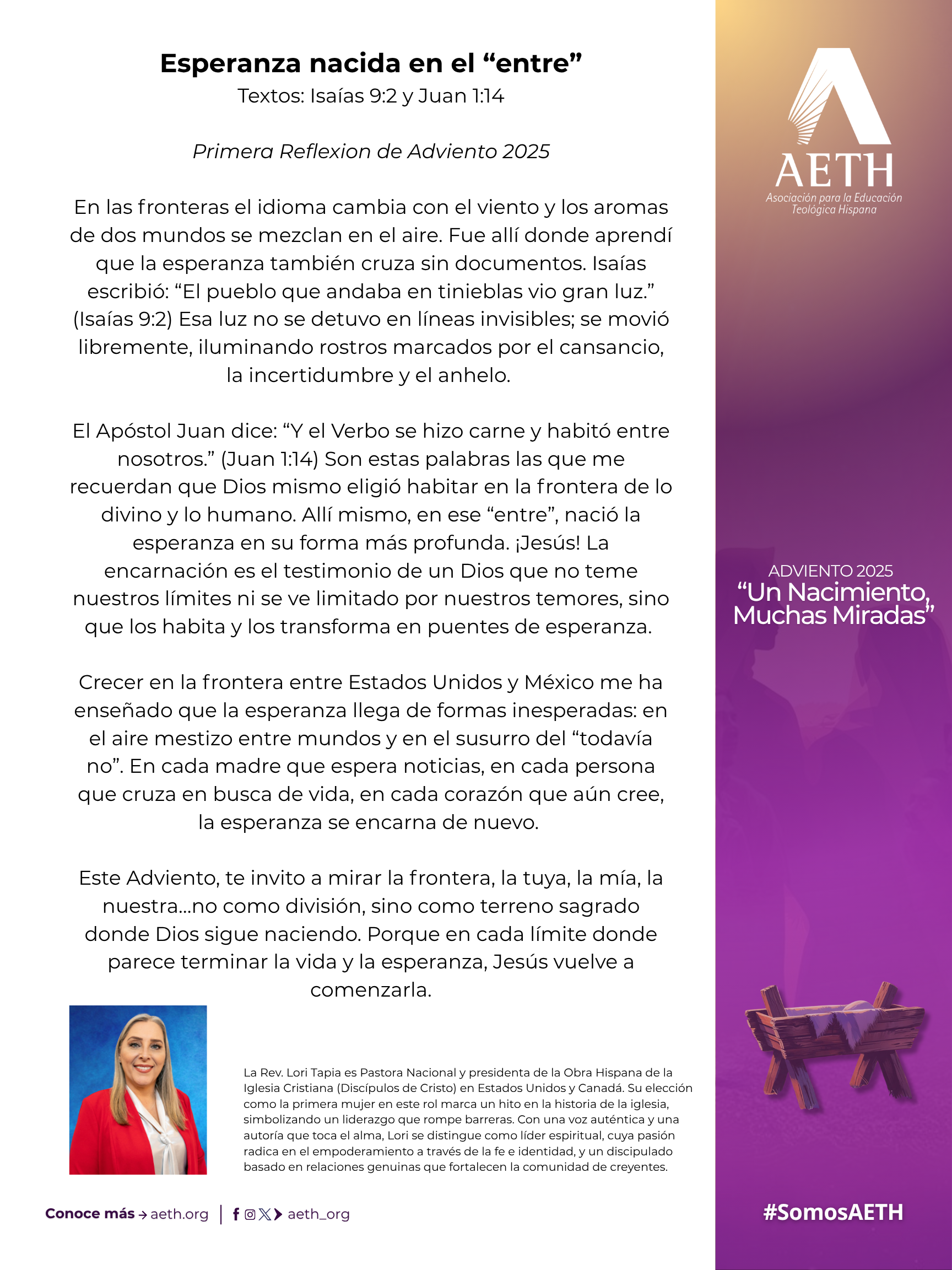 En esta primera semana de Adviento, recordamos que nuestra esperanza está en Dios, quien cumple sus promesas y nos guía con su luz. La Rev. Lori Tapia comparte una reflexión sobre la Esperanza nacida en el “entre”.